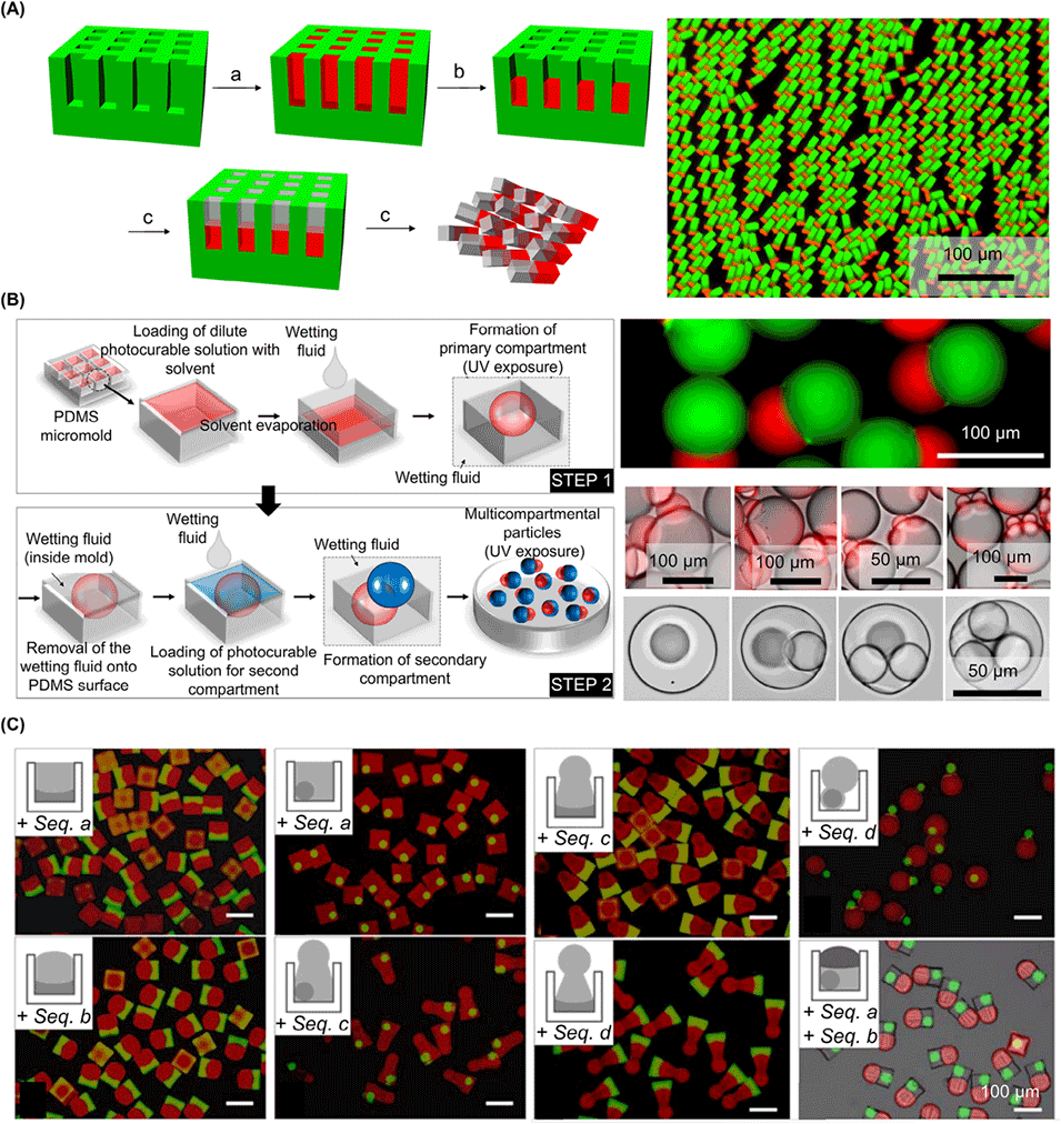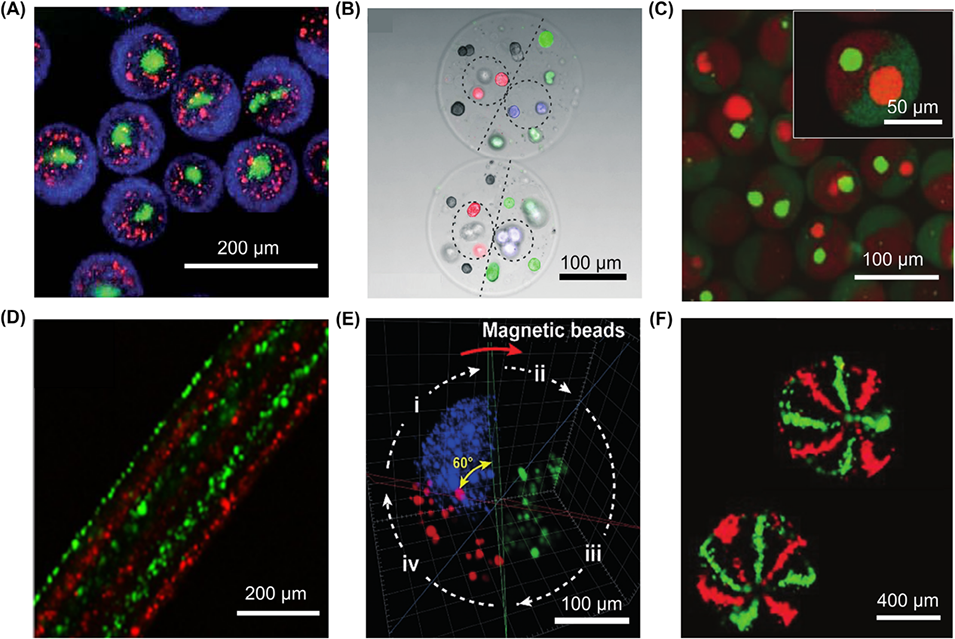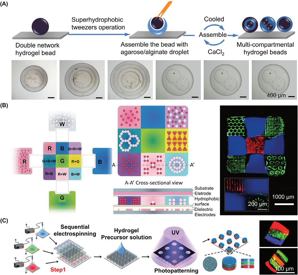 图11. 其他方法制备各向异性微载体。A)在超疏水表面上制备琼脂糖/海藻酸钠双网络多室各向异性微粒。B)通过电微流控平台两平行板间的两种主要电操纵技术(电润湿和介电泳)制备复杂三维结构。C)结合静电纺丝与光图案化技术制备非球形水凝胶微粒。