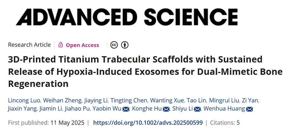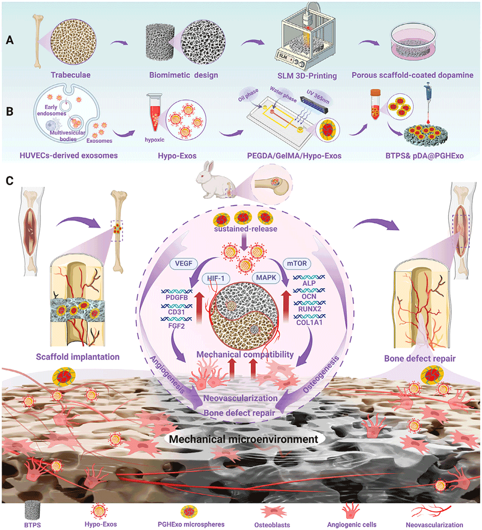当前Ti-6Al-4V骨植入体缺乏天然骨小梁结构和促血管生成信号,限制了修复效果。为此,南方医科大学吴耀彬副教授、黄文华教授、胡孔和博士以及暨南大学利时雨副教授等人创新性地将3D打印的仿生骨小梁支架与负载“缺氧外泌体”的水凝胶微球相结合,构建了一种双重仿生骨修复材料。该材料不仅成功模拟了天然骨的力学性能以避免应力屏蔽,还能持续释放生物活性信号,在动物实验中显著促进了成骨与血管生成。相关研究以“3D-Printed Titanium Trabecular Scaffolds with Sustained Release of Hypoxia-Induced Exosomes for Dual-Mimetic Bone Regeneration”为题目,发表于期刊《Advanced Science》。