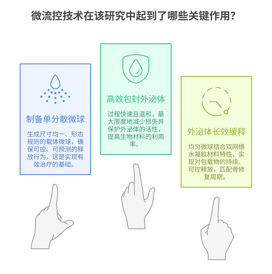 2、同时,采用微流控技术将缺氧诱导的人脐静脉内皮细胞(HUVEC)来源外泌体(HExo)包封于PEGDA/GelMA水凝胶微球(PGHExo)中实现缓释,并通过聚多巴胺(pDA)修饰将其锚定于BTPS表面形成BTPS&pDA@PGHExo复合支架。