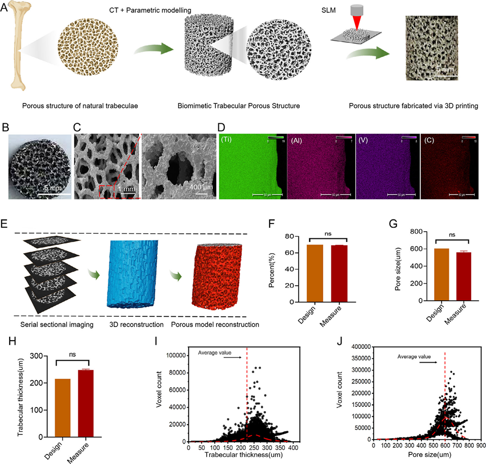1、本研究提出一种双重仿生策略,通过Voronoi 算法和成像数据设计,利用选择性激光熔化(SLM)3D 打印技术制备出仿生小梁多孔Ti-6Al-4V支架(BTPS),其弹性模量约为3.2 GPa、渗透率达11.52×10-8 mm²,可模拟天然骨的几何结构与力学性能。