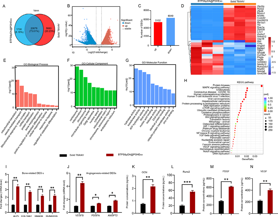 3、体外实验表明该支架显著促进成骨与血管生成,mRNA测序显示其通过激活MAPK、mTOR、HIF-1、VEGF等通路调控相关基因表达;兔体内实验证实其可提升骨体积、密度及新生血管形成,为大段骨缺损修复提供了具有临床潜力的个性化解决方案。