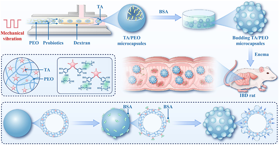 图1. 出芽 TA-PEO 微胶囊的制备及其用于 IBD 治疗的示意图。