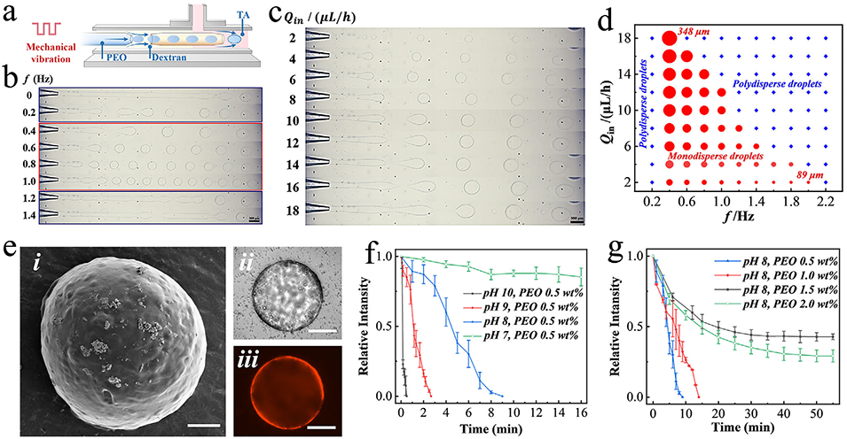 图2. a) 微流控装置示意图。b) 不同振动频率下生成的液滴显微图像。c) 不同内相流速下生成的液滴显微图像。d) 显示液滴直径、振动频率和内相流速之间关系的相图。e) TA-PEO 微胶囊的扫描电子显微镜图像 (i)、光学显微镜图像 (ii) 和荧光图像 (iii)。(i) 中比例尺为 20 μm,(ii, iii) 中为 50 μm。f) 由 0.5 wt.% PEO 制备的微胶囊中包裹的葡聚糖在不同 pH 条件下的释放曲线。(n = 3,生物学独立样本)。数据以平均值 ± 标准差表示。g) 由不同浓度 PEO 在 pH 8 条件下制备的微胶囊中包裹的葡聚糖的释放曲线。(n = 3,生物学独立样本)。数据以平均值 ± 标准差表示。