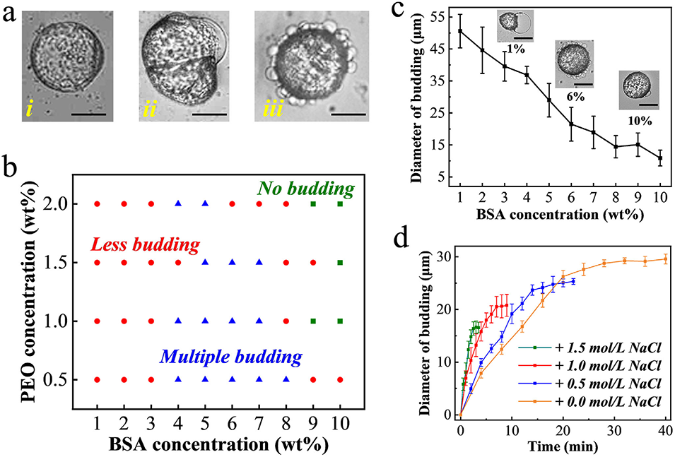 图3. a) 三种类型出芽微胶囊的代表性图像:(i) 无出芽,(ii) 少出芽,和 (iii) 多出芽;比例尺代表 50 μm。b) 显示不同 BSA 和 PEO 浓度对出芽状态影响的相图。c) 不同 BSA 浓度下获得的微胶囊出芽尺寸,并附有出芽微胶囊的代表性图像;比例尺代表 50 μm。(n = 3,生物学独立样本)。数据以平均值 ± 标准差表示。d) 由含不同浓度 NaCl 的 PEO 溶液制备的微胶囊在 BSA 溶液中出芽行为的比较。(n = 3,生物学独立样本)。数据以平均值 ± 标准差表示。
