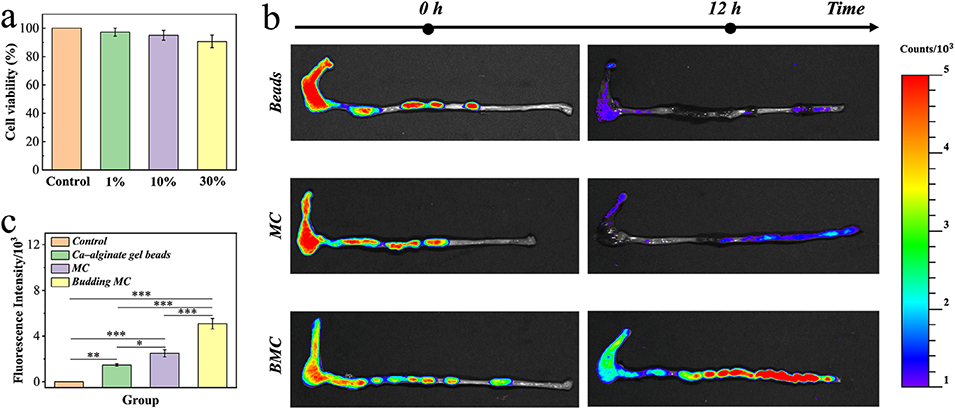 图4. a) 3T3 细胞与不同浓度出芽微胶囊共培养后的存活率。(n = 5,生物学独立样本)。数据以平均值 ± 标准差表示。b) 微球(Beads)、无出芽微胶囊(MC)、出芽微胶囊(BMC)灌肠给药后小鼠结肠的荧光图像。c) 不同组别相应荧光强度的定量分析。(n = 5,生物学独立样本)。数据以平均值 ± 标准差表示。*p < 0.05, **p < 0.01; ***p < 0.001,使用单因素方差分析及事后检验。