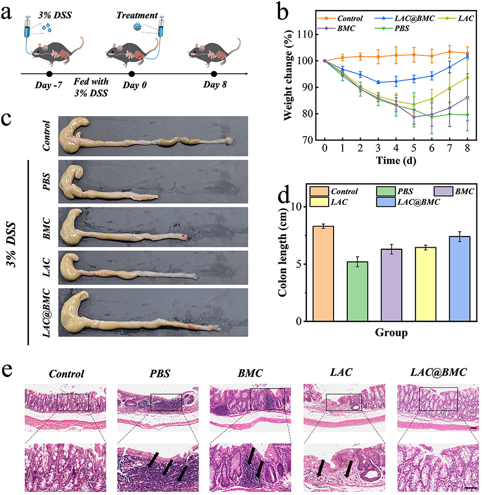 图5. a) IBD 大鼠建模和治疗示意图。b) 对照组、PBS 组、BMC 组、LAC 组和 LAC@BMC 组小鼠的体重变化。(n = 6,生物学独立样本)。数据以平均值 ± 标准差表示。c) 不同组别的结肠实物图。d) 不同组别结肠长度的柱状图。(n = 6,生物学独立样本)。数据以平均值 ± 标准差表示。e) 不同组别结肠切片的代表性 H&E 染色图像。放大图比例尺分别为 100 μm和 50 μm。