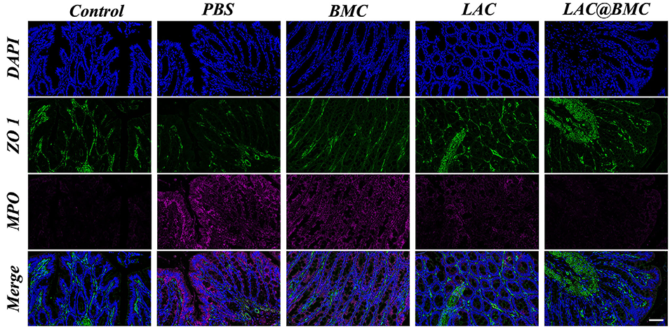 图6. 对照组、PBS 组、BMC 组、LAC 组和 LAC@BMC 组结肠切片的代表性 ZO-1 和 MPO 免疫荧光染色图像。比例尺:50 μm。
