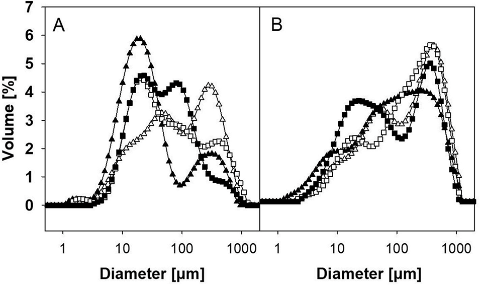 图1. 储存1天的水包油包水(W/O/W)乳液粒径分布。该乳液由含4%(A)或8%(B)聚甘油蓖麻醇酸酯(PGPR)的初级乳液制备而成,其中初级乳液的水相比例为10%(三角形)或30%(正方形),且初级乳液在最终乳液中的占比为20%(空心符号)或40%(实心符号)。