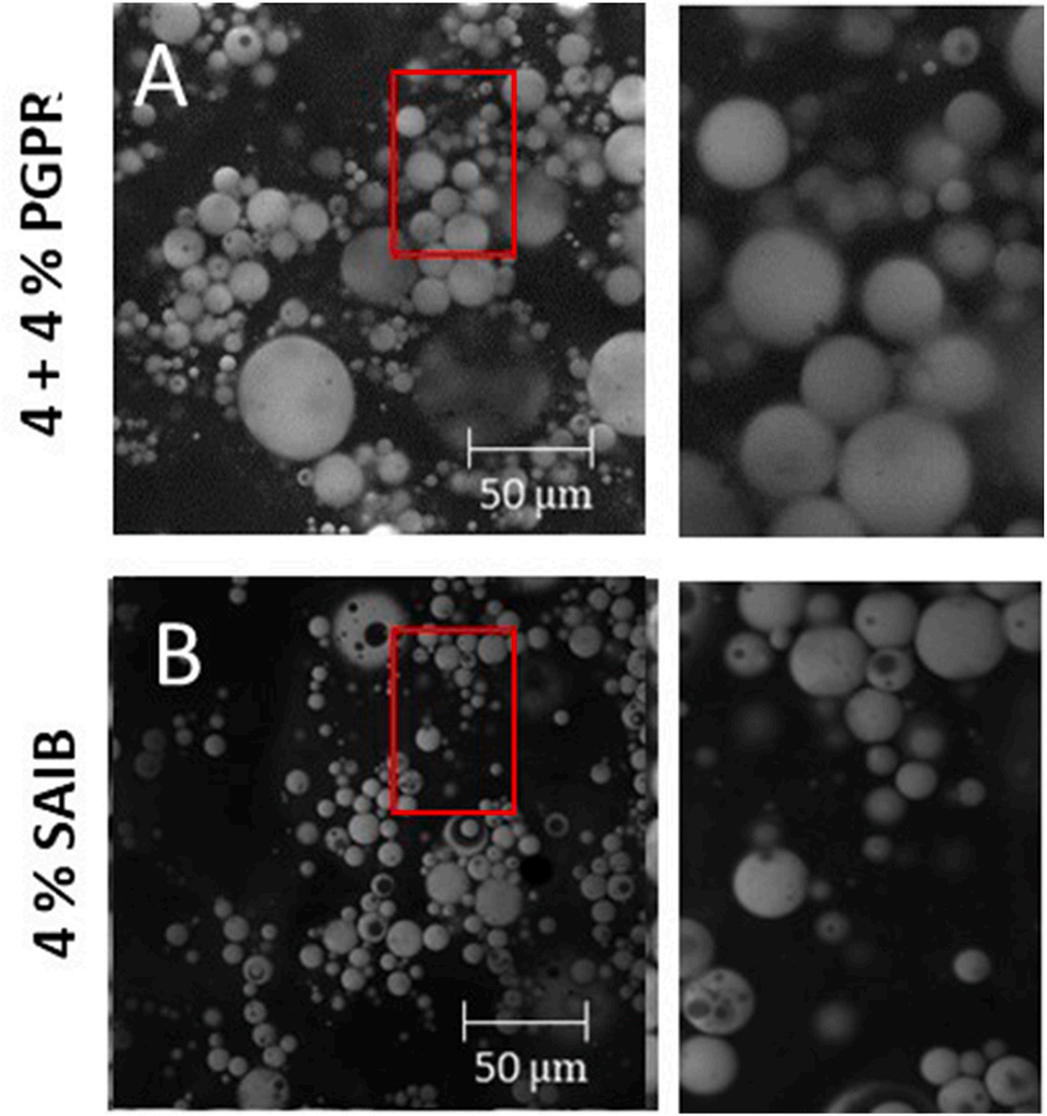 图3. 40%水包油包水(W/O/W)乳液的微观结构。该乳液的初级油包水(W/O)乳液(水相比例30%)初始含4%聚甘油蓖麻醇酸酯(PGPR,基于油相),在第一次均质后分别额外添加了4%PGPR(A)或10%乙酸异丁酸蔗糖酯(SAIB,基于油相)(B)。