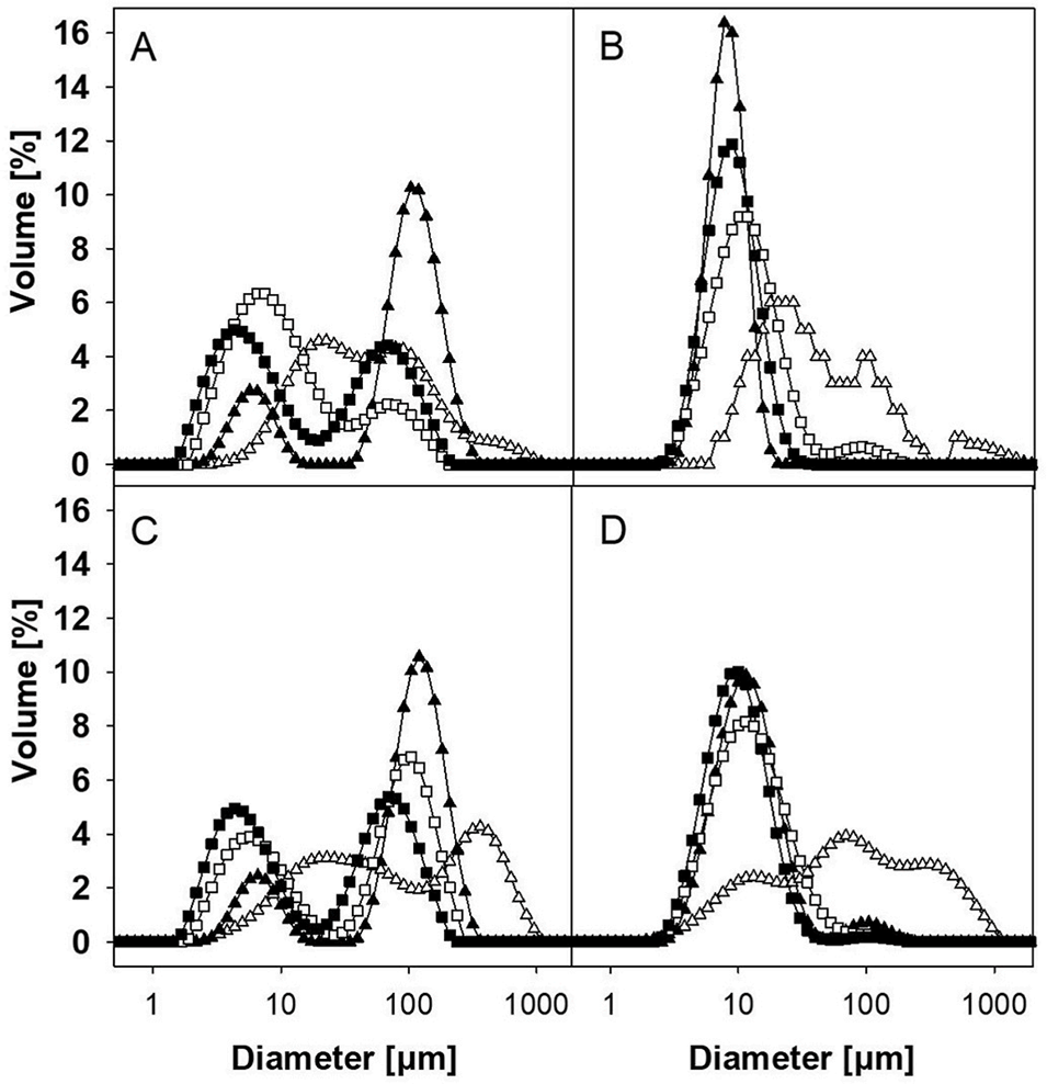 图4. 水包油包水(W/O/W)乳液(相比例12/28/60)在水(A、C)和十二烷基硫酸钠(SDS)溶液(B、D)中的粒径分布。该乳液由含4%(A、B)或8%(C、D图)聚甘油蓖麻醇酸酯(PGPR,基于油相)的初级乳液制备而成,且采用不同均质方法:三角形代表剪切均质(空心符号为8000rpm剪切1分钟,实心符号为20500rpm剪切2分钟);正方形代表高压均质(空心符号为30bar,实心符号为100bar)。注:采用剪切均质制备的乳液,其外水相中还添加了黄原胶。