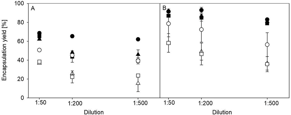 图6. 水包油包水(W/O/W)乳液(相比例12/28/60)的包封率与稀释比例的关系。该乳液由含4%(A)或8%(B)聚甘油蓖麻醇酸酯(PGPR)的初级乳液制备而成,分别用盐糖溶液(实心符号)或水(空心符号)稀释;检测时间点为稀释当天(圆形)、储存7天后(三角形)和储存14天后(正方形)。