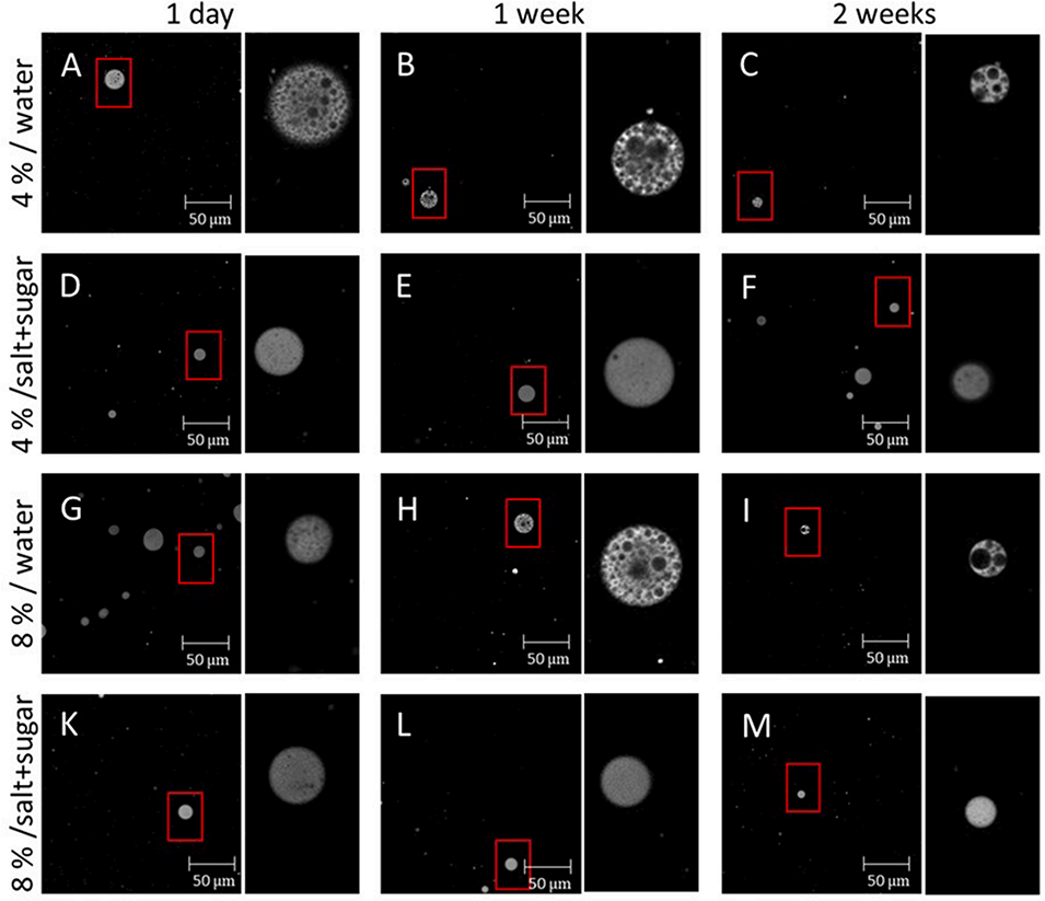 图7. 水包油包水(W/O/W)乳液(相比例12/28/60)的微观结构。该乳液的油相中分别含4%(上两行)或8%(下两行)聚甘油蓖麻醇酸酯(PGPR),用1:200比例的水或盐糖溶液(浓度与内水相一致)稀释后,分别在稀释当天、储存1周后和储存2周后进行观察。为减少扩散,观察前均向样品中添加了黄原胶。