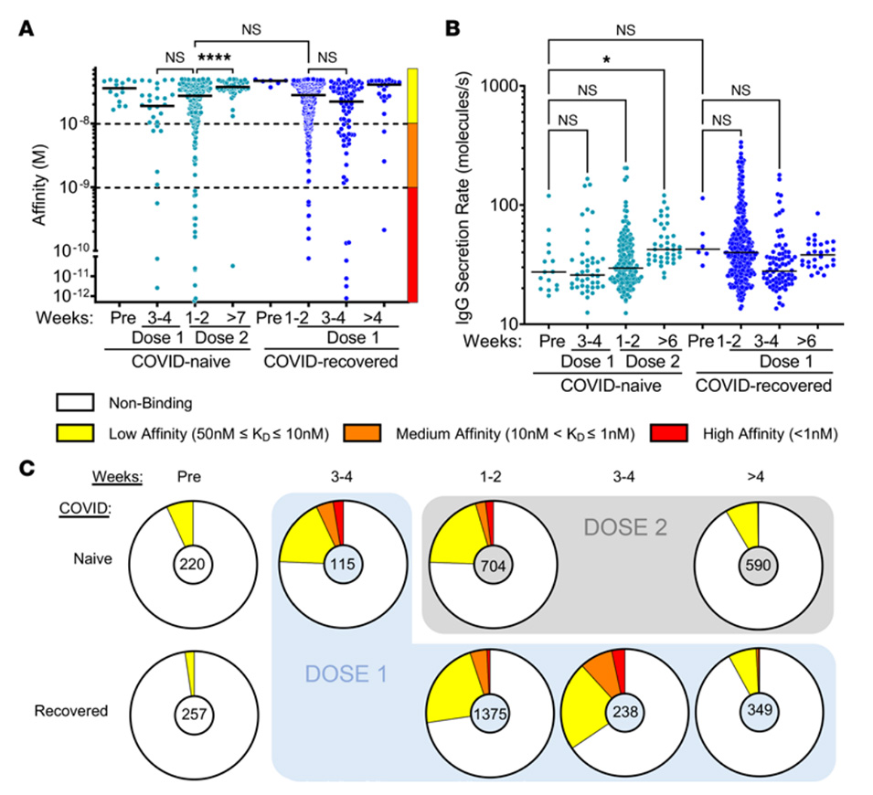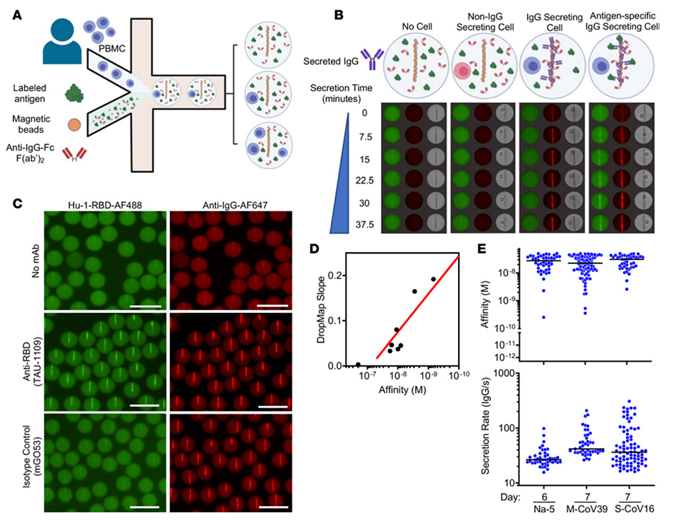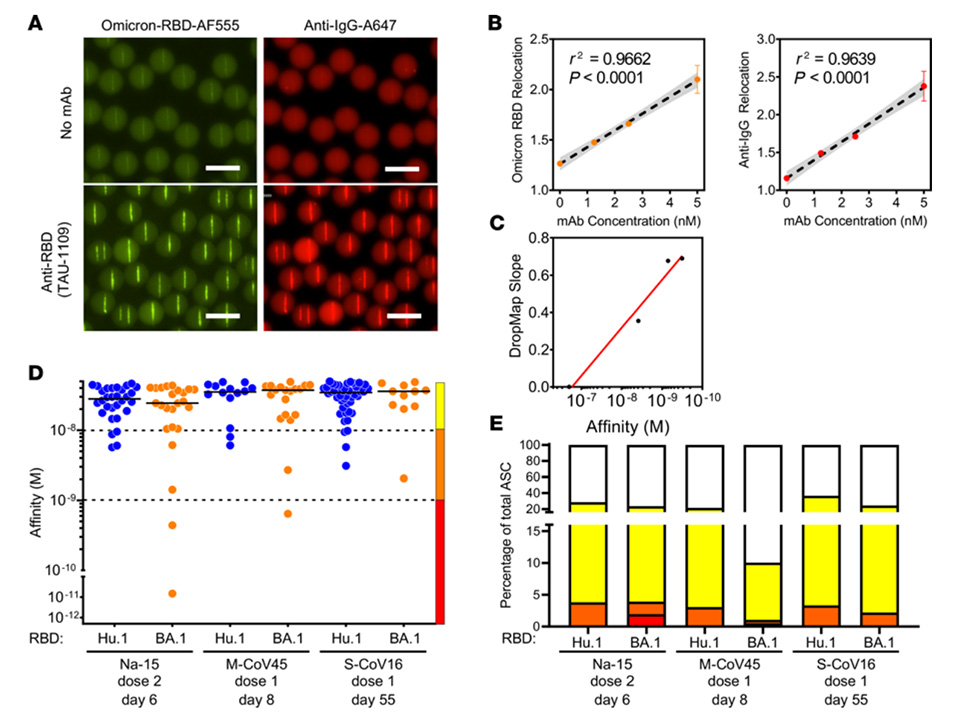 2.通过使用微流控技术和成像方法,对接种疫苗的免疫原始细胞和新冠肺炎康复个体进行了研究,发现了针对SARS-CoV-2刺突受体结合结构域(RBD)的抗体亲和力的高度个体间变异。