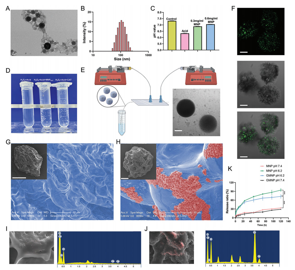中和酸性微环境: GMNP 由矿化的转化生长因子-β(TGF-β)和过氧化氢酶(CAT)纳米颗粒组成。微球通过碳酸钙矿化层捕捉多余的氢离子。这一过程有助于中和酸性微环境,这对缓解炎症至关重要。