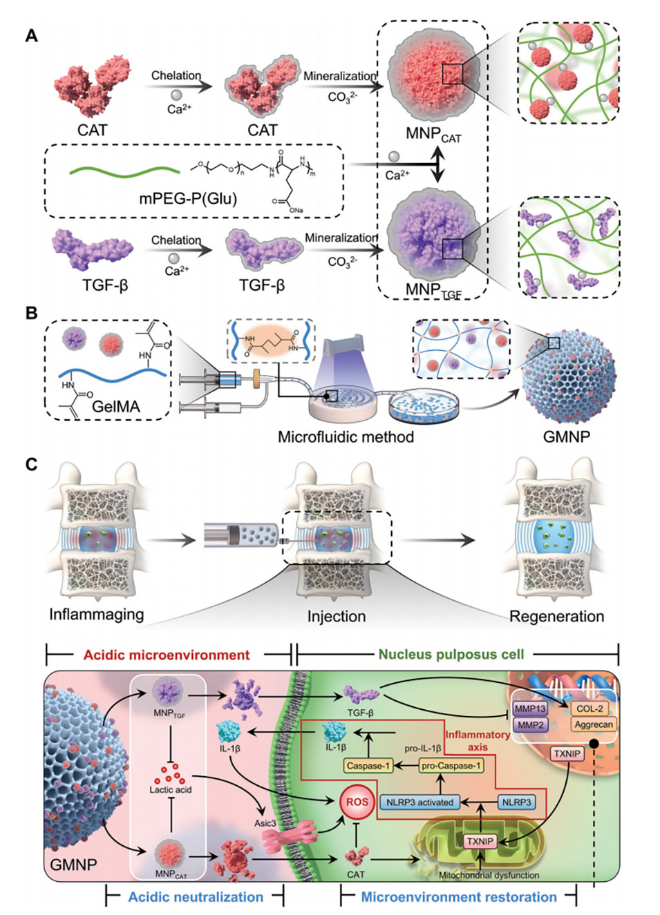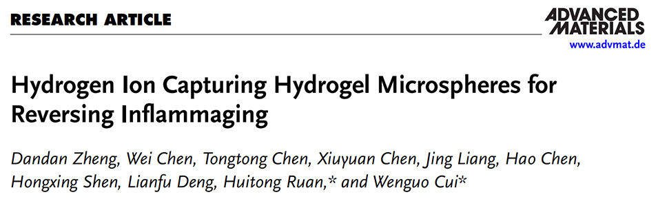 近期,上海交通大学医学院附属瑞金医院崔文国教授等人通过仿生矿化和微流控技术开发了由矿化的转化生长因子-β(TGF-β)和过氧化氢酶(CAT)纳米颗粒组成的捕获氢离子的水凝胶微球(GMNP),用于阻断炎症中的NLRP3级联反应。相关研究以“Hydrogen Ion Capturing Hydrogel Microspheres for Reversing Inflammaging”为题目,发表在期刊《Advanced Materials》上。