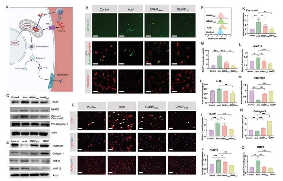 2、本研究开发了一种捕获H+的水凝胶微球(GMNP),通过捕获过量H+来中和酸性微环境,释放TGF-β和CAT以抑制NLRP3炎症小体的激活,从而有效逆转炎症。