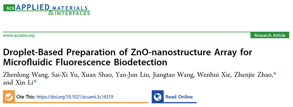 近期,华东师范大学赵振杰教授&李欣副教授等人提出了一种简单的液滴微流控芯片,通过改变整个生长时间和补液间隔,成功获得了静态液滴阵列,用于原位生长不同直径的氧化锌纳米结构。相关研究以“Droplet-Based Preparation of ZnO-nanostructure Array for Microfluidic Fluorescence Biodetection”为题发表在《ACS Applied Materials & Interfaces》上。