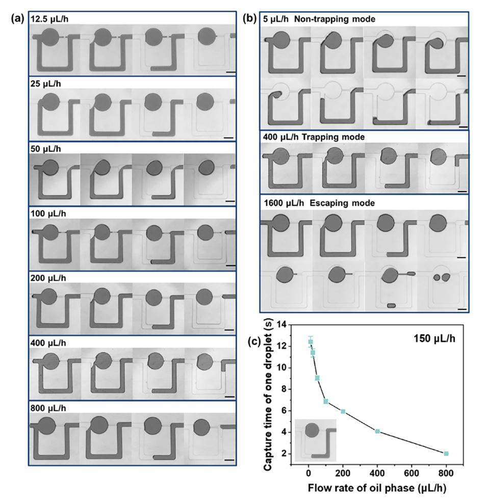 图3.(a)不同油相流速下成功捕获液滴的图像(12.5−800μL/h)。(b)不同油相流速下的三种捕获模式。Q=5μL/h,油相流速较小时无法捕获液滴;Q=400μL/h,成功捕获了液滴;Q=1600μL/h,过大的油相流速导致捕获的液滴逃离生长腔室。(c)捕获单个液滴所需的时间随油相流速的变化而变化。比例尺为400μm。