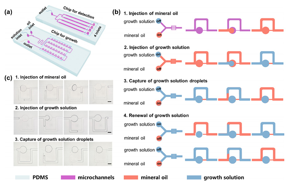 图1.(a)生长芯片和检测芯片的示意图。在进行荧光生物检测之前,使用生长芯片制备ZnO纳米结构。样品溶液被加载到检测芯片上的平行微通道中进行进一步研究。(b)流程图说明了单个液滴的生成和营养物质的补充,以实现长期生长。(c)图像显示了微腔捕获单个液滴的三个步骤(比例尺:400μm)。
