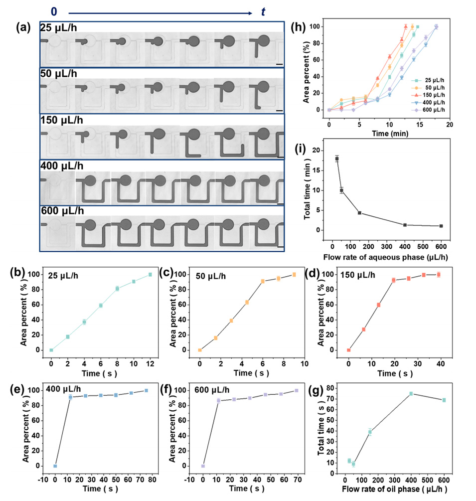 图2.(a)水相占据的单个生长室的图像,随水相流速的变化而变化。所有图像的比例尺为400μm。显示了水相占据生长室的面积百分比,随着水相流速的变化而变化:(b)Q=25μL/h(c)Q=50μL/h(d)Q=150μL/h(e)Q=400μL/h(f)Q=600μL/h。(g)水相以不同流速完全填满生长腔室所需的总时间。(h)颈部通道被水相占据的面积百分比随时间变化,取决于水相的流速。(i)水相以不同流速通过32个捕获结构所需的总时间。