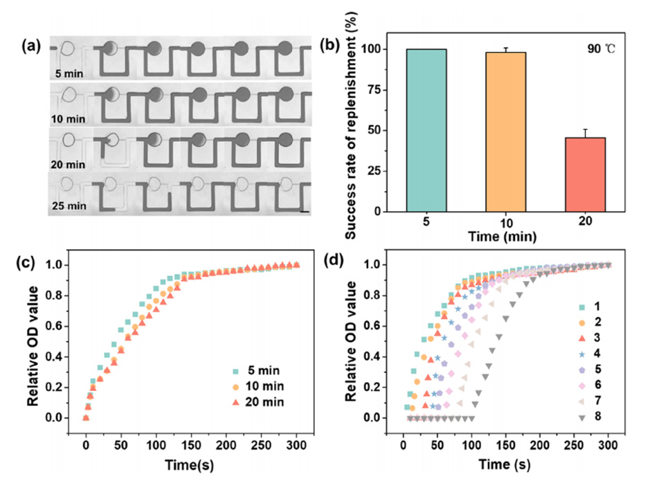 图4.(a)不同时间间隔下补充过程的图像。所有图像的比例尺为400μm。(b)不同时间间隔下补充成功率。(c)不同时间间隔下单个生长腔室中光密度值随时间的变化。(d)直到完成替换为止,八个排成一行的液滴的光密度值随时间的变化,以第一个生长腔室中的液滴更新为起点。