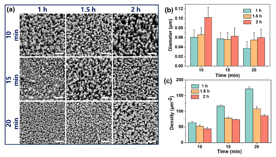 图5.(a)ZnO纳米结构在不同的补充间隔和总生长时间下的扫描电镜图像。比例尺为500nm。(b)在不同的补充间隔和总生长时间下生长的ZnO纳米结构的平均直径。(c)在不同的补充间隔和总生长时间下生长的ZnO纳米结构的密度。(N=5)。