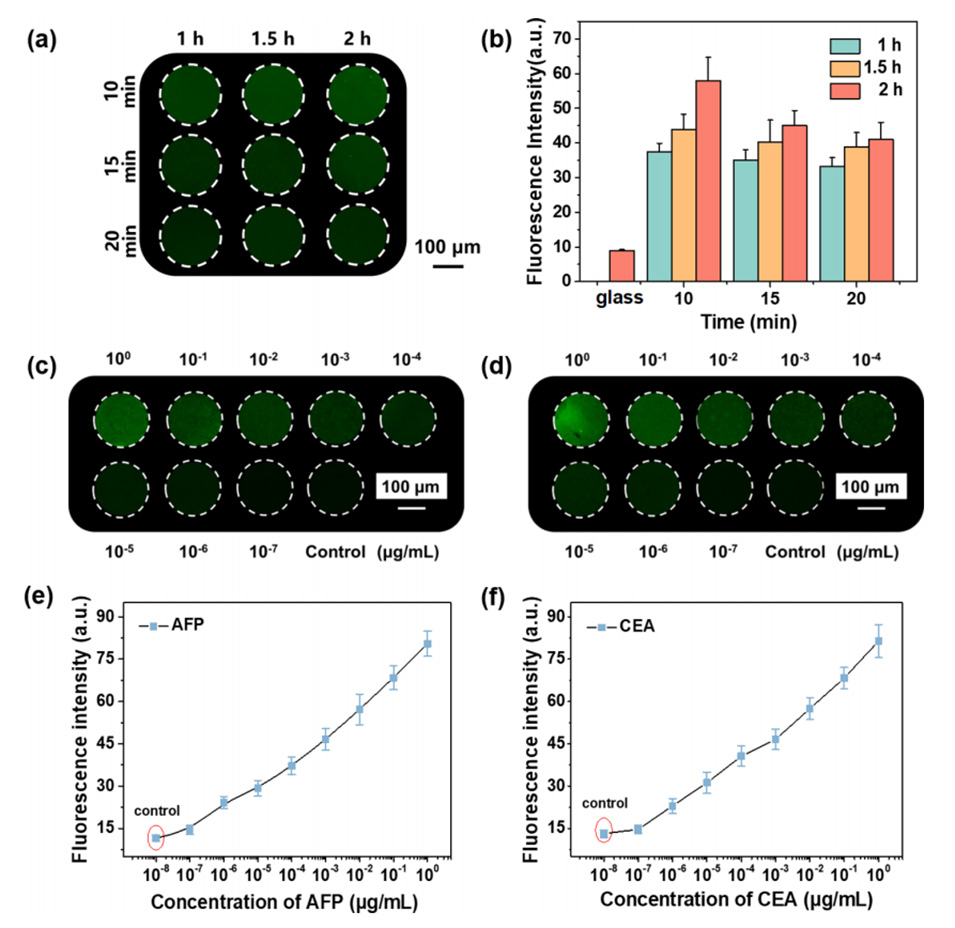图6.(a,b)采用不同补充间隔和生长时间下合成的氧化锌纳米结构检测FITC-antiIgG的荧光图像和(b)荧光强度的定量分析,以及玻璃基板作为对照。(c)在生长室中ZnO纳米结构上不同APF浓度的荧光图像和(e)荧光强度的定量分析。(d)在生长室中ZnO纳米结构上不同CEA浓度的荧光图像和(f)荧光强度的定量分析。(N=5)。