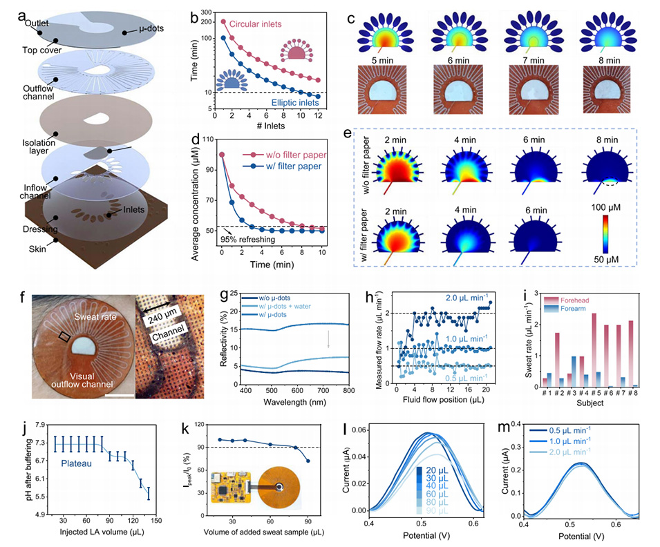 图4.用于动态运动汗液分析和评估的可穿戴多模态生物芯片的人体评估。