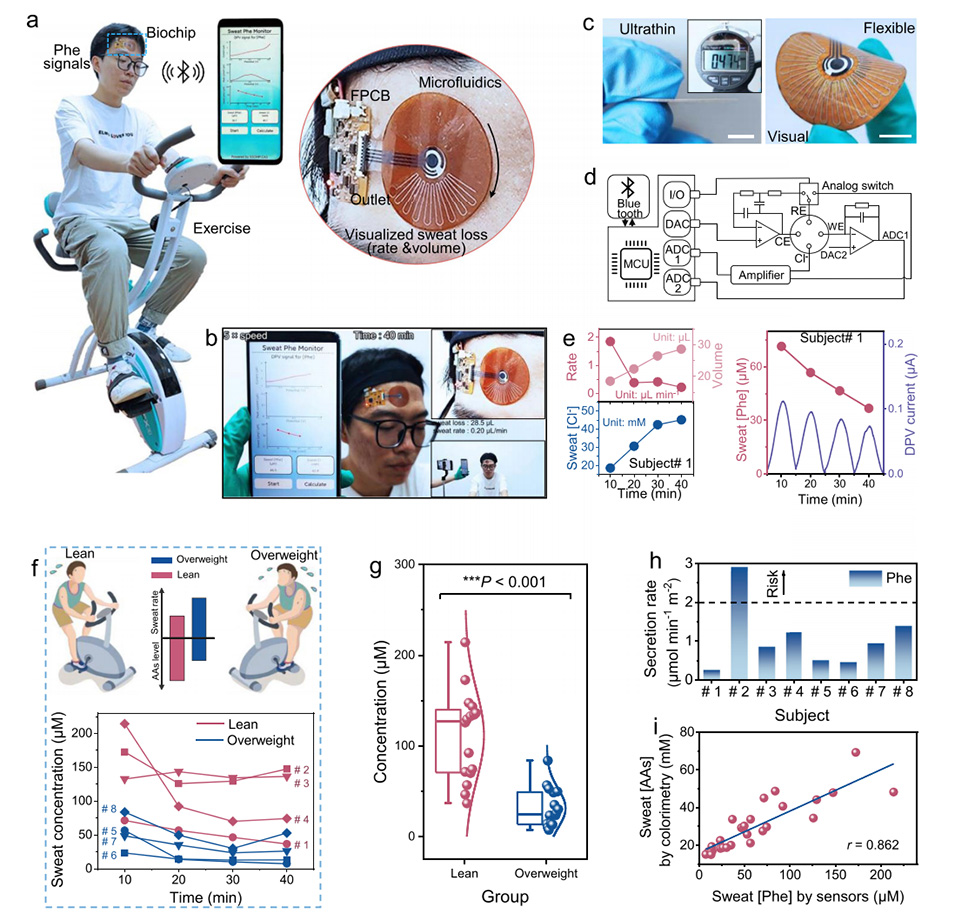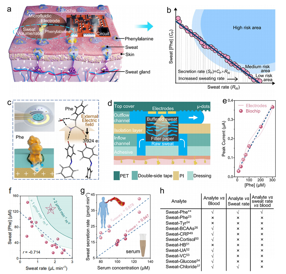 近期,中科院半导体研究所王丽丽研究员团队开发了一种可穿戴的多模态生物芯片,集成了先进的电化学电极和多功能微流控通道,可以同时定量多种汗液指标,包括苯丙氨酸和氯化物,以及汗液速率。相关研究以“Interindividual- and blood-correlated sweat phenylalanine multimodal analytical biochips for tracking exercise metabolism”为题发表在《Nature Communications》上。