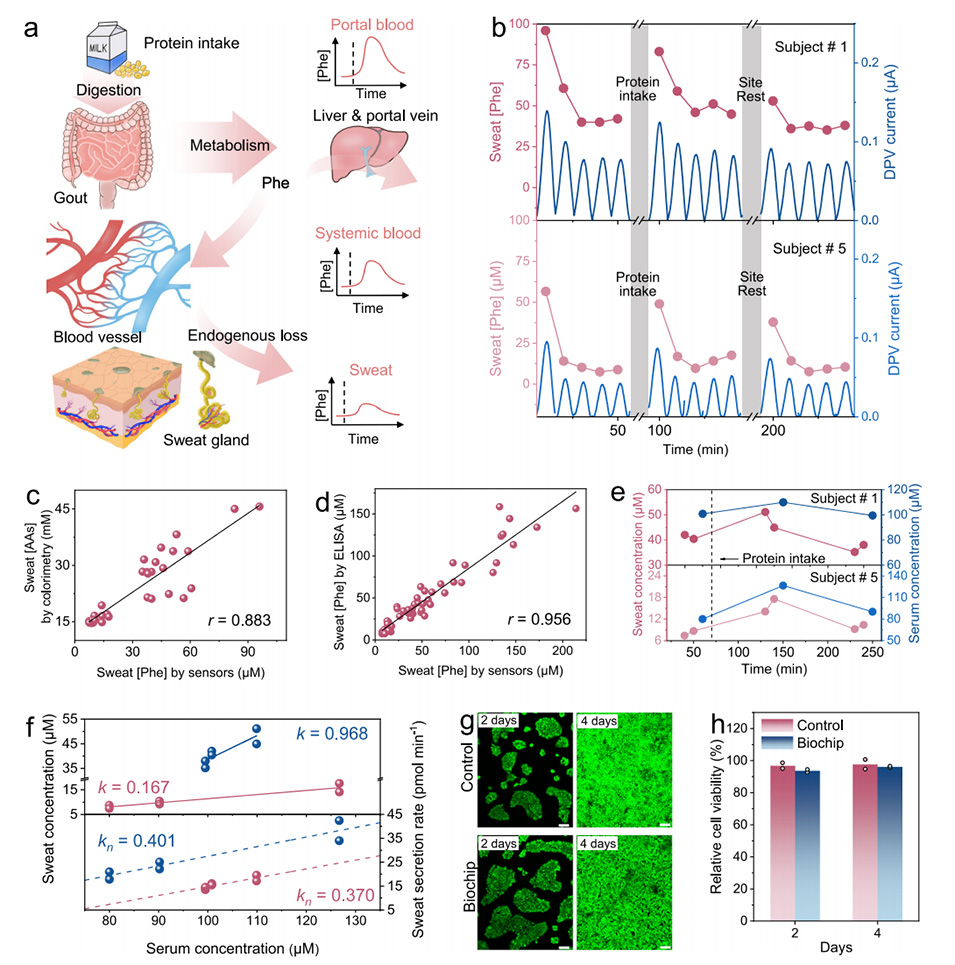 3、通过追踪运动过程中蛋白质摄入引起的苯丙氨酸波动,并通过汗液速率对浓度指标进行归一化以减少个体间变异性,本研究展示了一种用于分析汗液-血液苯丙氨酸水平的可靠方法,以进行个人健康监测。