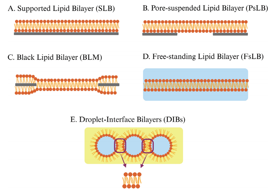 图1.支持脂质双层及其基于修饰的脂质仿生模型的示意图(未按比例)。