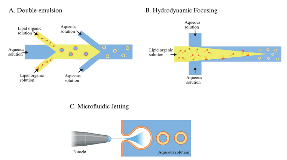 图3.在微流体中形成脂质囊泡的不同技术的示意图:A)基于双乳液;B)流体动力学聚焦和C)微流控喷射。