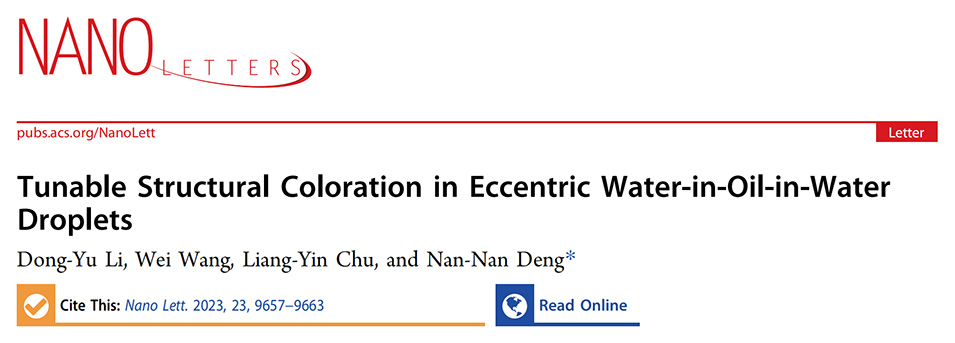 近期,上海交通大学邓楠楠副教授团队通过微尺度凹面界面的全内反射和干涉,展示了无色水包油包水双乳液液滴中可调节的结构色。相关研究以“Tunable Structural Coloration in Eccentric Water-in-Oil-in-Water Droplets”为题目,发表在期刊《Nano Letters》上。