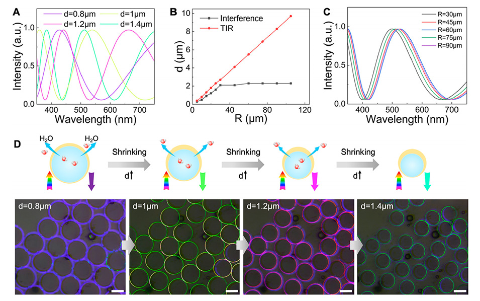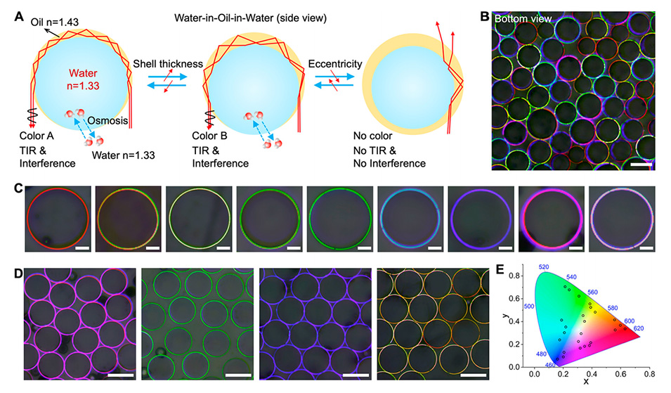 1、在水包油包水(W/O/W)双乳液液滴中,通过微尺度凹面界面的全内反射和干涉实现可调结构着色,从而产生虹彩结构色。