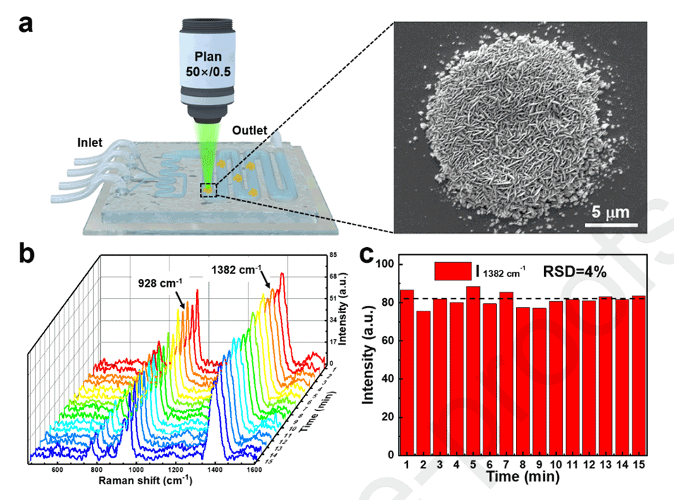 图1.(a)左图:通过“激光直写”在微通道中制备银聚集体的示意图。右图:典型银聚集体的扫描电镜图像。(b)实时原位监测水相条件下柠檬酸盐在银聚集体上的SERS强度。(c)1382cm-1处的时间依赖性SERS强度。