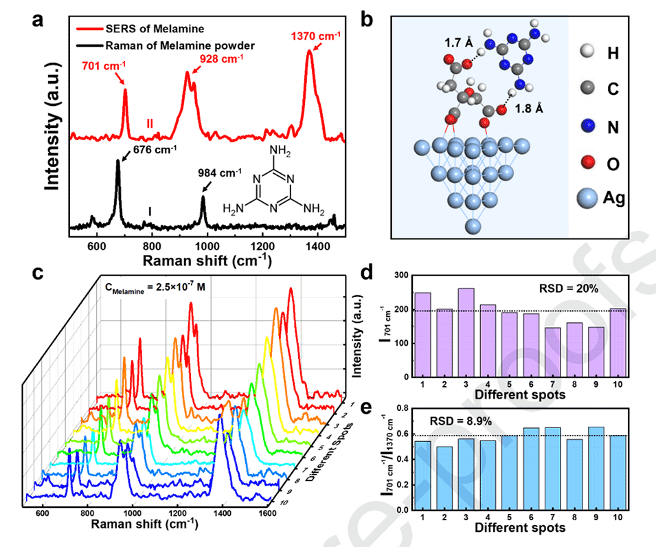 图2.(a)对比银聚集体上三聚氰胺的普通拉曼(I)和SERS(II)。插图展示了三聚氰胺分子的示意图。(b)使用DFT方法优化的Ag20-柠檬酸盐-三聚氰胺复合物构型。柠檬酸盐通过Ag-O键吸附在Ag表面。三聚氰胺通过胺基(三聚氰胺)与羧酸基(柠檬酸盐)的氢键结合被“困住”。(c)在银聚集体上随机获取的三聚氰胺的SERS。(d)-(e)在1370cm-1处归一化前后I701cm-1的RSD统计。