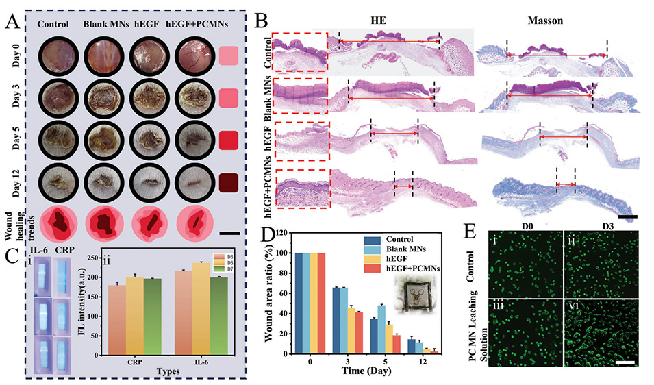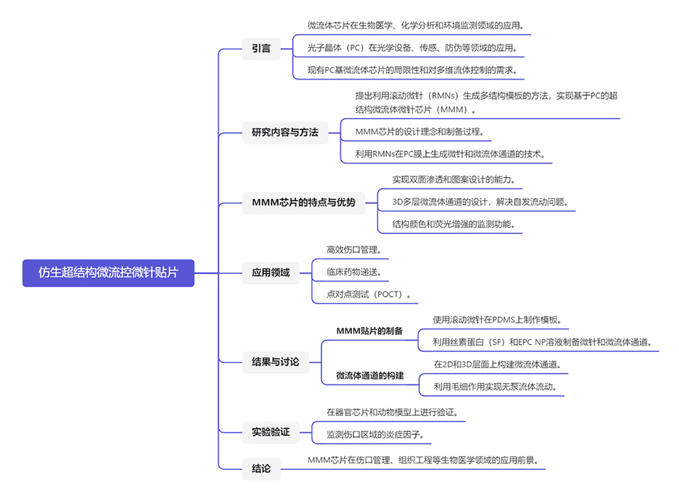 1、本研究利用滚动微针(RMNs)生成多结构模板的方法,实现了基于光子晶体膜(PC)的超结构微流体微针芯片(MMM),用于高效的伤口管理。