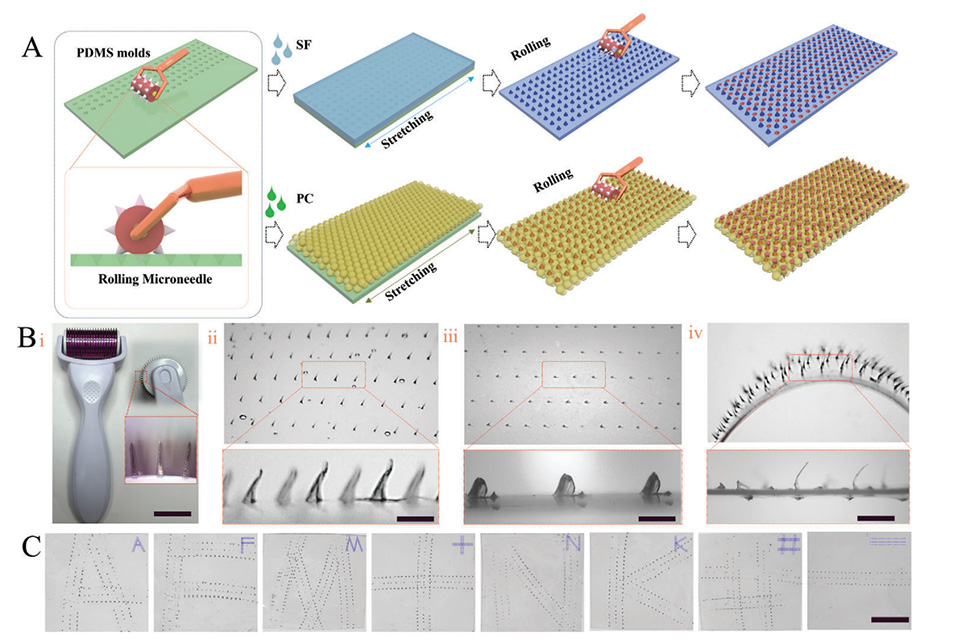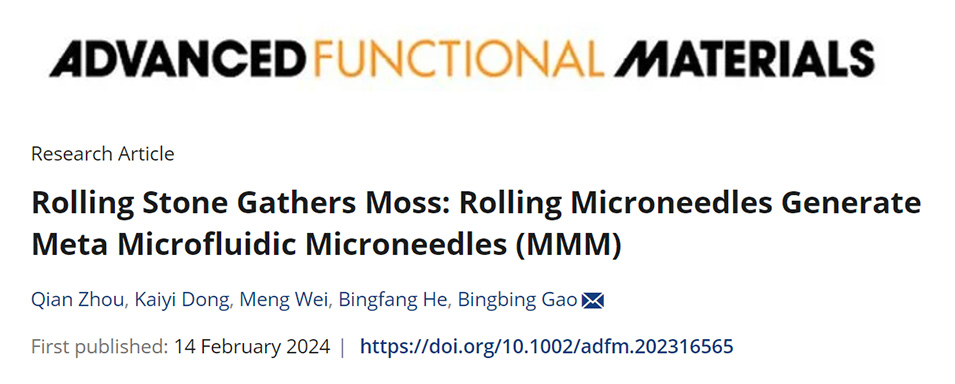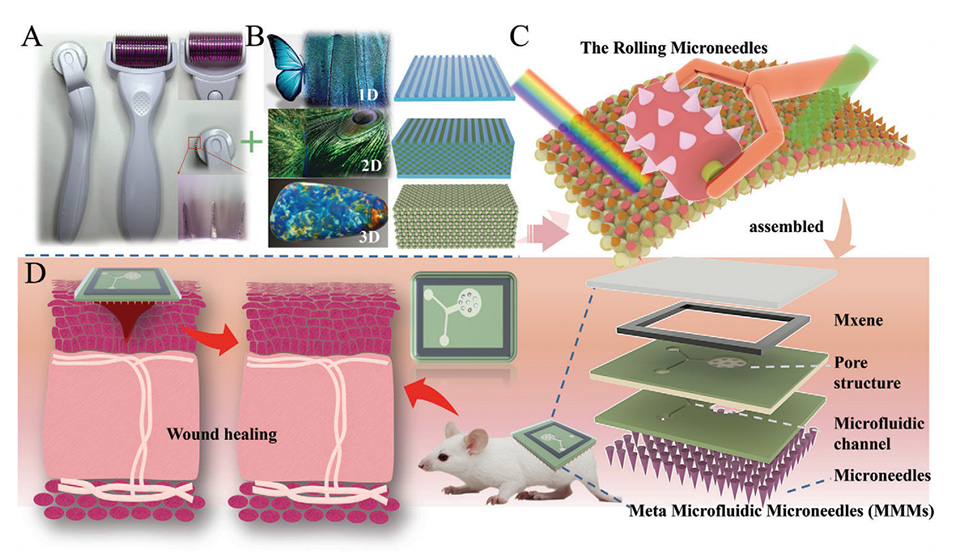近期,南京工业大学高兵兵副教授团队利用滚动微针制备了基于光子晶体的仿生超结构微流控微针贴片,用于高效伤口管理和生物医学应用。相关研究以“Rolling Stone Gathers Moss: Rolling Microneedles Generate Meta Microfluidic Microneedles (MMM)”为题目,发表在期刊《Advanced Functional Materials》上。