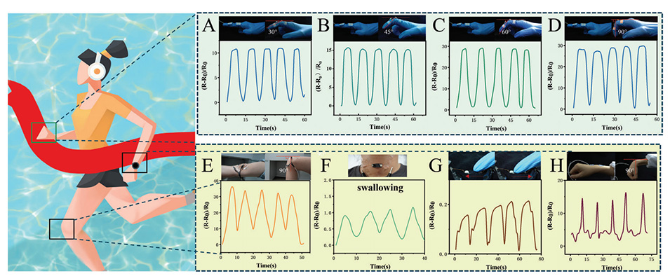 图5.贴在手指、手腕、膝盖和喉咙处的MMM贴片,用于实时传导响应。