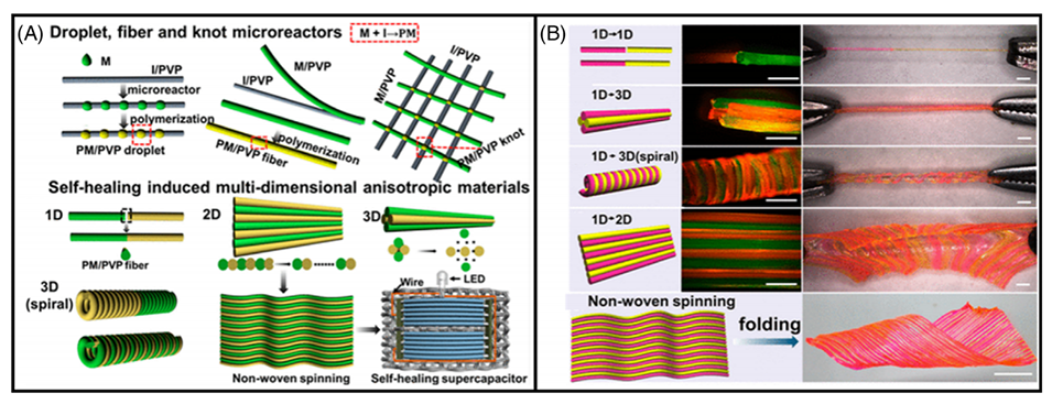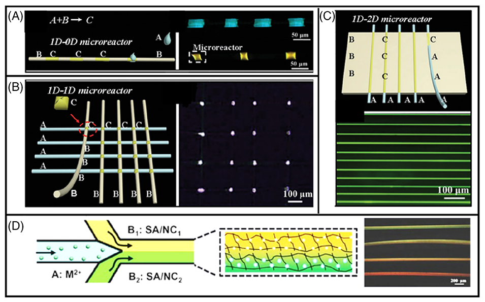 图2.基于FSC策略的(A)1D-0D液滴、(B)1D-1D结、(C)1D-2D平行纤维微反应器的示意图和荧光显微镜照片。(D)纤维作为微反应器的概念和用途,纤维内部发生连续的化学反应。