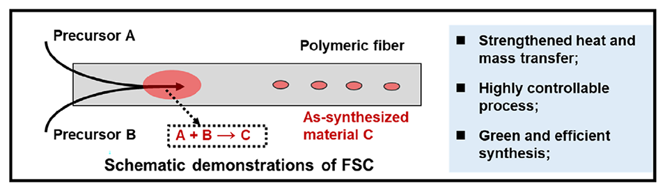 2、FSC利用纺丝纤维作为微反应器,可增强传质和传热,从而实现微/纳米材料的高效合成。与传统的间歇式反应器相比,FSC具有工艺高度可控、高效绿色合成和连续生产等优势。