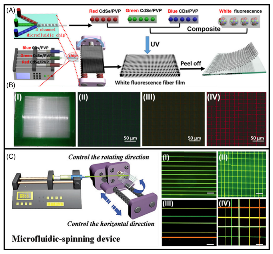 图3.(A)使用FSC制备的荧光纤维膜的示意图。(B)通过微流体纺丝原位生成CdSe QDs纤维膜。(C)基于微流体纺丝的FSC策略的示意图。