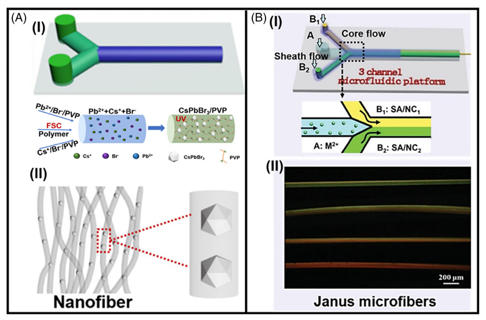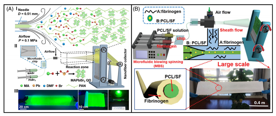图5.(A)用于原位生成PQD/纳米纤维膜的微流体吹纺FSC策略的示意图。(B)使用微流体吹纺FSC策略制造的可生物降解纤维蛋白原涂覆PCL/SF核壳纳米纤维支架的示意图。