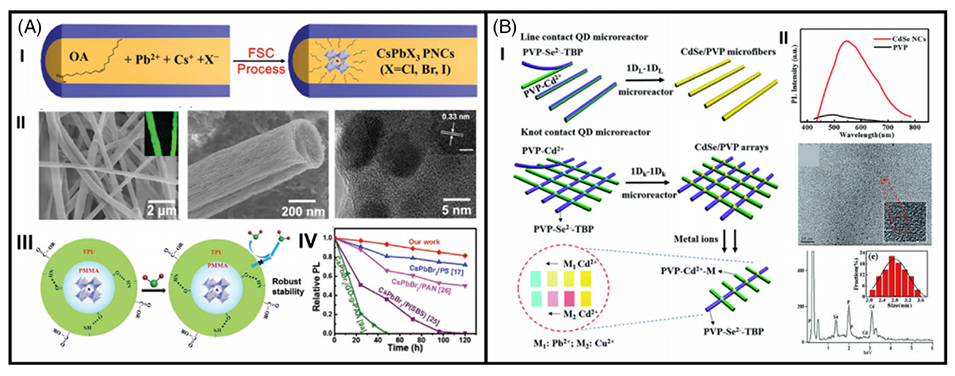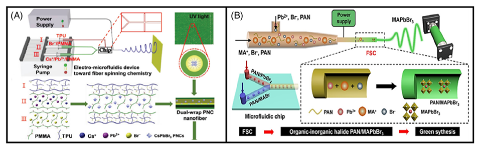图4.(A)利用电微流控FSC技术一步法制备CsPbBr3/PMMA/TPU核壳纳米纤维薄膜,以及通过FSC策略原位形成纤维薄膜的机理。(B)使用EMS制备有机-无机卤化物PAN/MAPbBr3纳米纤维薄膜的示意图。