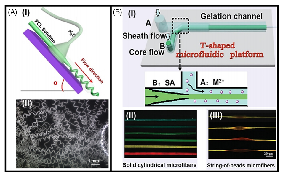 图7.(A)用于制备PCL螺旋纤维样品的T型微流控芯片示意图。(B)用于制备纳米晶负载藻酸盐荧光复合微纤维的T型微流控芯片。