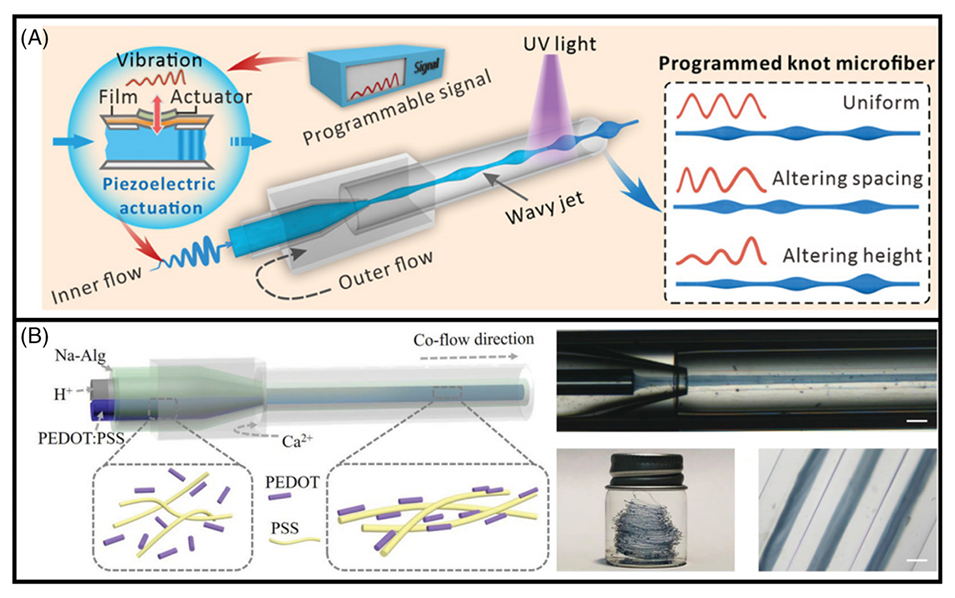 图8.(A)压电微流体纺丝平台的示意图。(B)采用微流控纺丝技术形成含有PEDOT的微纤维的过程示意图。
