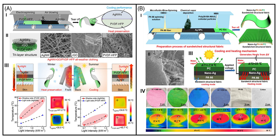 图11.(A)纤维纺丝非对称化学组装(FACA)制备AgNW/rGO/PVDF-HFP纳米纤维薄膜,用于全天候智能纺织品。(B)用于全天候个人热管理的三明治结构纺织品。