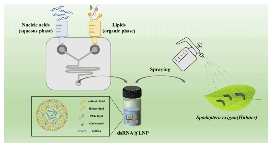 图1.利用微流控技术制备脂质纳米粒子包裹的dsRNA用于防治甜菜夜蛾的示意图。