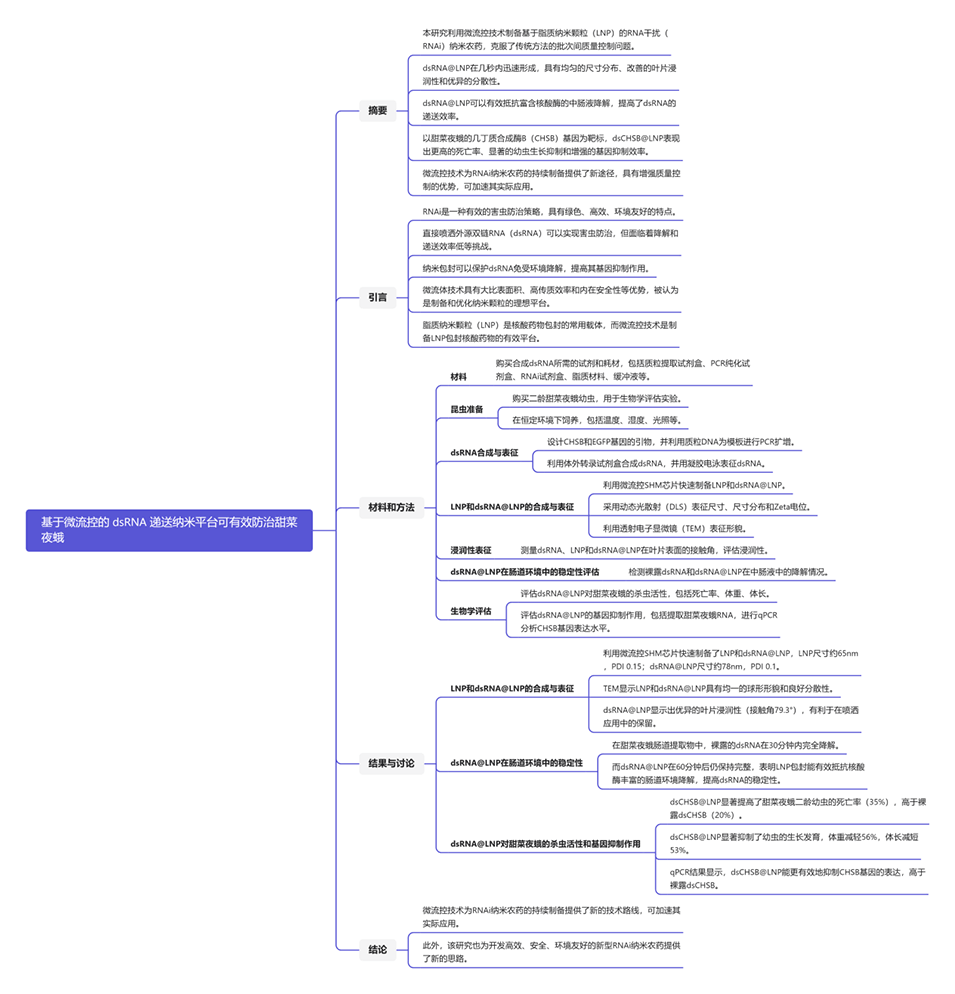 1、本研究提出了一种基于微流控的纳米平台,以脂质纳米颗粒(LNP)作为纳米载体,利用微流控技术增强的传质和连续处理能力来制备RNAi纳米农药。