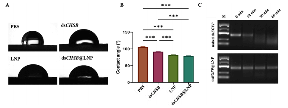 4、提升稳定性和递送效率:微流控制备的dsRNA@LNP在植物叶片上表现出更好的润湿性,并在昆虫中肠富含核酸酶的环境中具有增强的稳定性,从而提高了RNAi对害虫的防治效果。